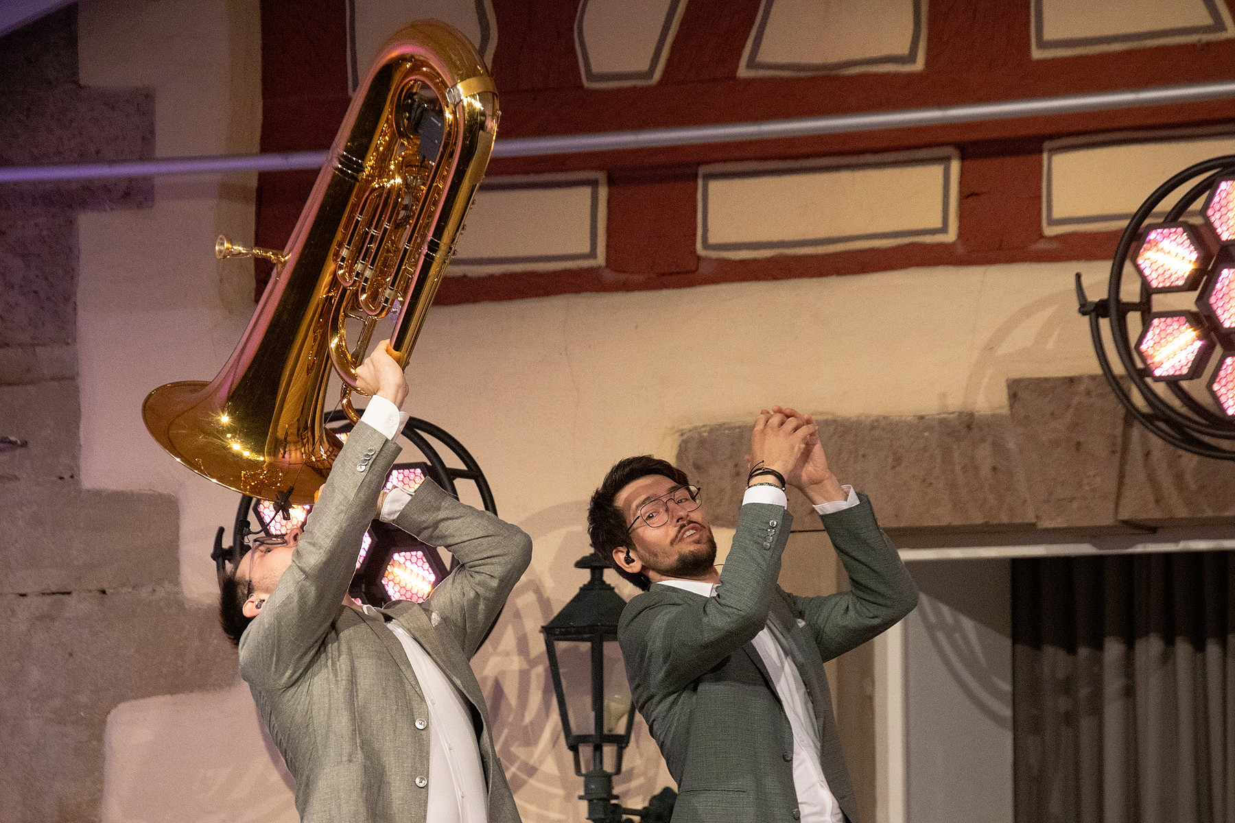 Von ganz anderem Charakter war der zweite Abend mit den Hanke-Brothers. Allein die Instrumente der vier Brüder verrieten einiges: David spielt eine Vielzahl von Flöten und übernimmt die launige Moderation. Lukas glänzt mit der Bratsche, Jonathan „tanzt“ auf den Tasten und Fabian erstaunt mit der Vielfalt seiner Tuba. Die Hanke Brothers sind ein Kammermusikensemble, das sich der "Neuen Klassik" verschrieben hat. „Wir möchten die Leute auf den Geschmack bringen, hin und wieder auch mal ein Klassik-Konzert zu genießen“, sagen sie. Der Abend im Schlosshof des CVJM war sicher ein hervorragender Appetitanreger. Ilse Konjevic aus Stuttgart hatte eine Einladung zu diesem Konzert und sprudelte vor Begeisterung: „Es ist fazinierend, wie diese verschiedenen Instrumente harmonisch zusammenspielen und mit welcher mitreißenden Freude die Vier auf der Bühne agieren.“ Die vier Hankes ließen ihre Instrumente sprechen mit der Botschaft „Express yourself“, ein Stück voller Ausdruck und Bewegung auf der Bühne. Als „Tönemacher“ führten sie durch die vier Naturelemente und die Länder Europas, luden zu sich nach Hause ein zu „Hankes Night Meal“ und präsentierten ihr musikalisches „Change of Winds“. Mit einem gemeinsamen Segenslied entließen sie ihr Publikum in den Sommerabend.