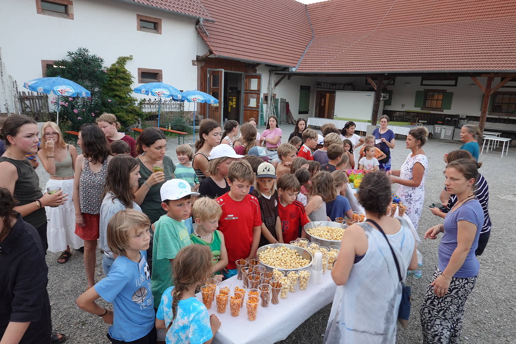 Das Abendprogramm bestand darin, dass sich die Kindergartenkinder, die Schulkinder und die Erwachsenen jeweils in den Gruppen zu einer ersten Kennenlernrunde trafen, in denen sie die nächste Woche während der Bibelzeit sein werden. Nach dem Abendabschluss in der Mitte des Marienhofs war dann auch schon der erste Tag zu Ende.