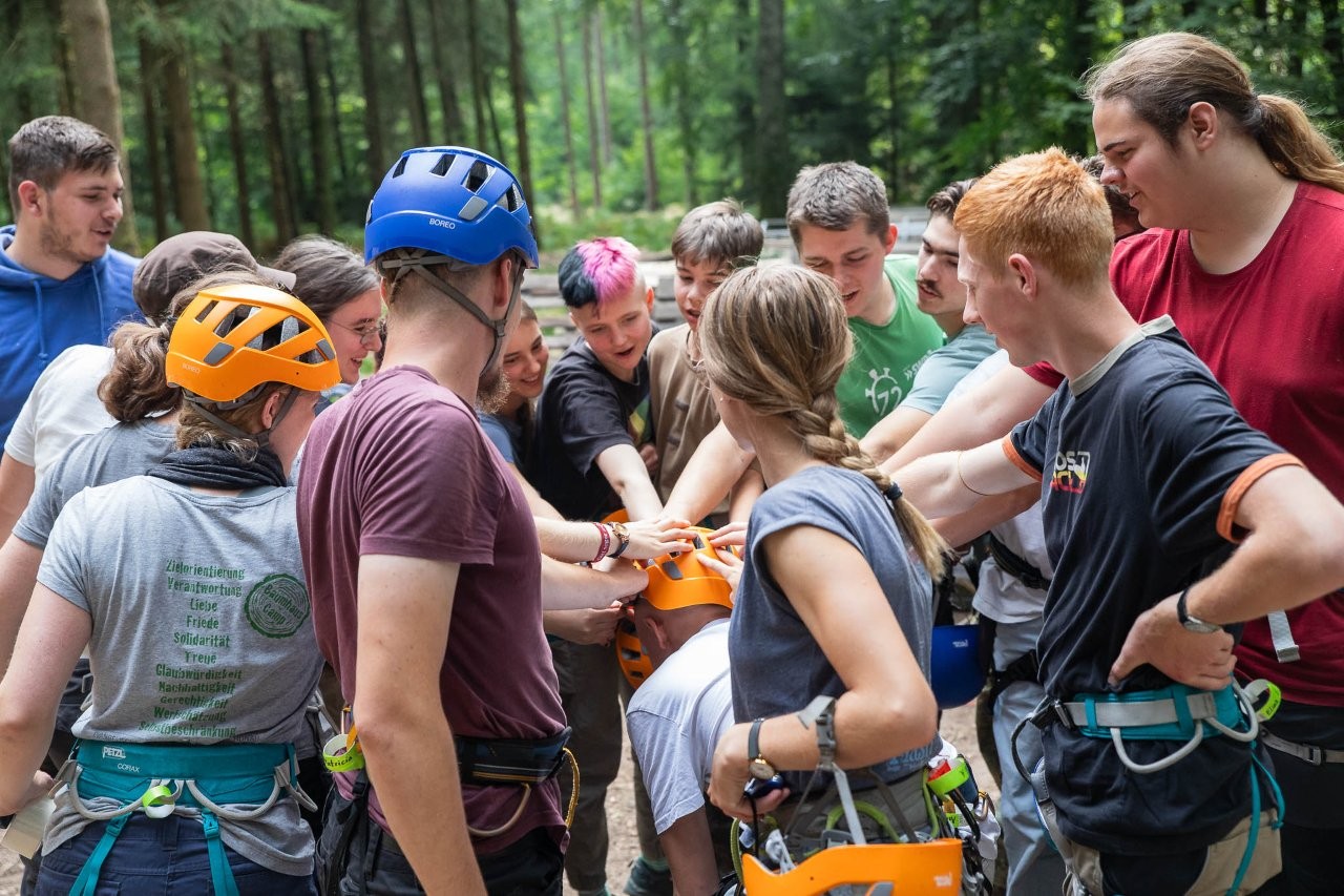 Baumhauscamp bedeutet aber auch Bauen. Der zweite Hauptfokus neben unserem geistlichen Thema liegt natürlich auf dem Bauen. Da hatten wir uns dieses Jahr einiges vorgenommen: Zu den bereits vorhandenen fünf Plattformen plus Steg kamen noch einmal vier Plattformen, ein weiterer Steg, unsere allererste Netzplattform sowie eine geniale Rutsche dazu. Darauf können wir echt stolz sein! Es ist jedes Jahr am Ende des Camps beeindruckend zu sehen, wie viel wir in dieser kurzen Zeit geschafft haben. Natürlich war es anstrengend, natürlich haben wir geschwitzt, und manchmal hatte man auch keine Lust auf den zehnten Bund in Folge. Aber jeder hat für den Erfolg des Teams mitgearbeitet. Die Jugendlichen hatten die Chance, ihre Komfortzone zu verlassen und über sich hinauszuwachsen. Der eine hat vielleicht seine Höhenangst überwunden, der andere hatte das erste Mal Hammer und Nagel in der Hand, wieder ein anderer hat zum ersten Mal jemanden gesichert. Im Baumhauscamp bekommt jeder die Chance, über sich hinauszuwachsen.