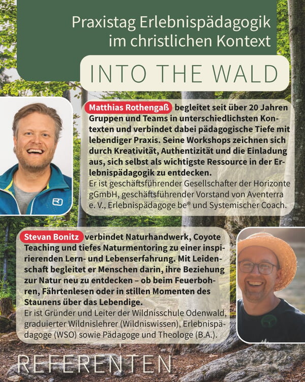 • Wildnispädagogik – Lass dich von den Abenteuern in der Natur inspirieren und entdecke, wie gemeinschaftliche Aktivitäten und handwerkliche Techniken deine Kreativität entfalten können. Gemeinsam denken wir darüber nach, was wir als christliche Erlebnispädagog:innen von der Wildnispädagogik lernen können.