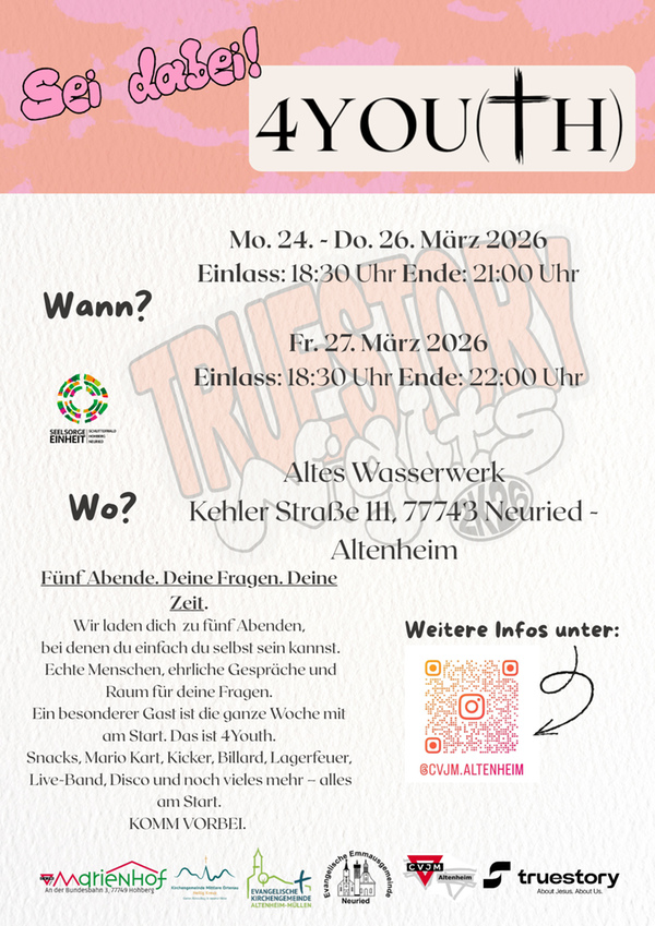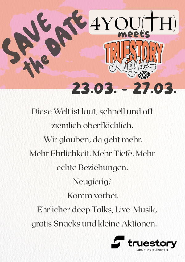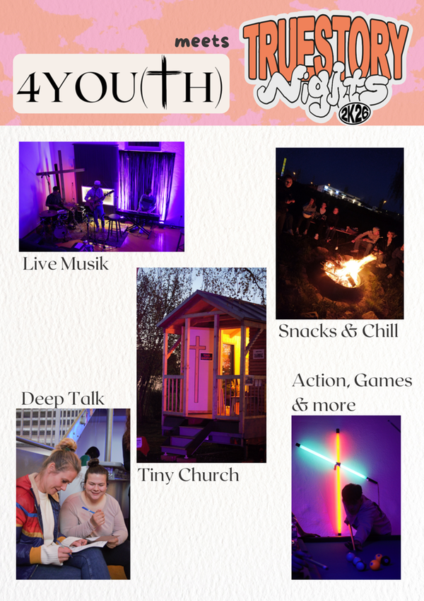 Wir laden dich ein zu fünf Abenden, bei denen du einfach du selbst sein kannst. Echte Menschen, ehrliche Gespräche und Raum für deine Fragen. Ein besonderer Gast ist die ganze Woche mit am Start. Das ist 4Youth. Snacks, Mario Kart, Kicker, Billard, Lagerfeuer, Lagerfeuer, Live-Band, Disco und noch vieles mehr - alles ist am Start.